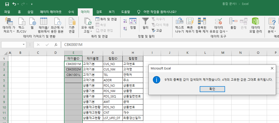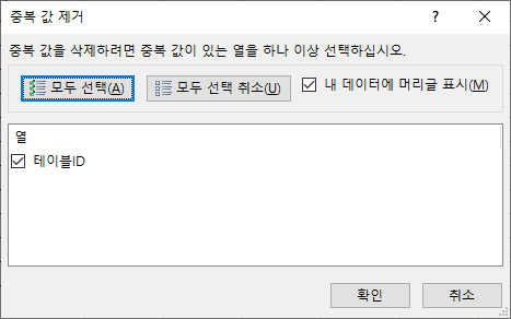 '테이블ID'열이 중복제거 되어 표시된 것을 확인할 수 있습니다.