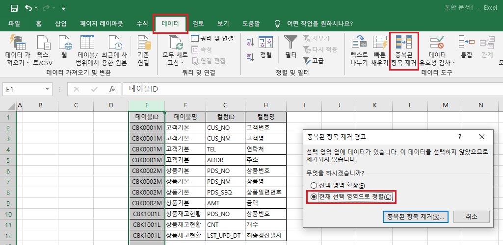 3. [중복된 항목 제거 경고] 창에 뜨면 ( 안 뜨는 경우도 있습니다 )