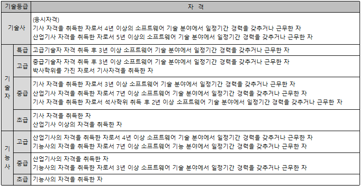 - 특급 : 고급기술자 자격을 취득한 자로서 3년 이상의 소프트웨어 기술 분야에서 일정기간 경력을 갖추거나 근무한 자
