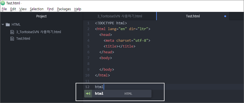 다음 예문은 "html"이라고 입력한 후 자동완성형으로 생성된 문법입니다.