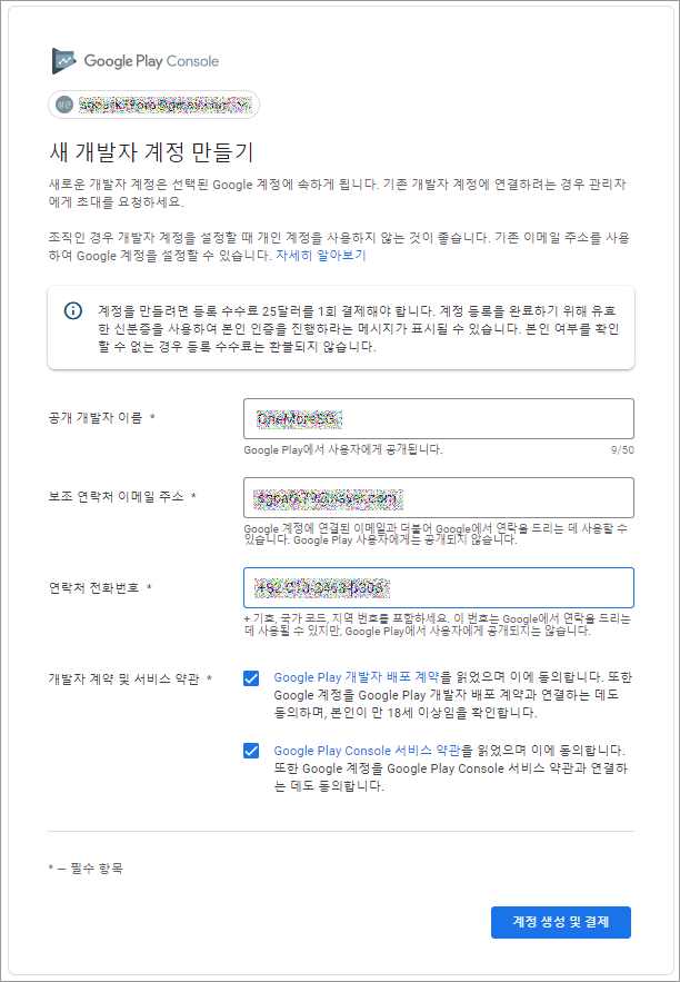 ※ 개발자 계정은 등록시 1회에 한하여 25달러의 등록비가 있습니다.