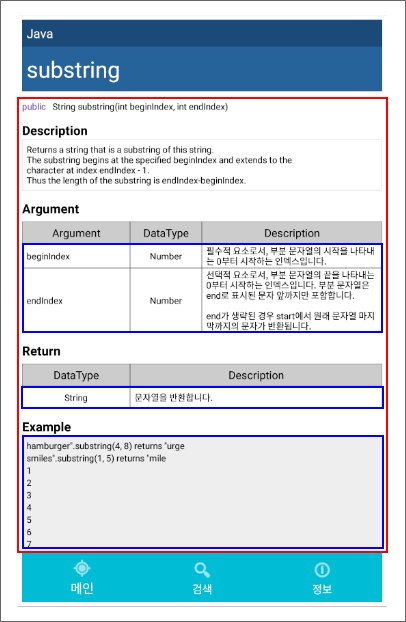 위와 같은 경우, Example의 파란색 영역의 데이터가 많아서, 전체화면을 넘어가면, ScrollView객체를 이용하면 이중 스크롤이 생기게 되어 의도하지 않은 결과가 나타날 수 있습니다.